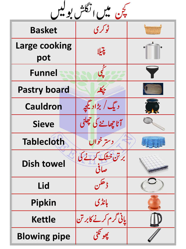 Here, in this article, you’re going to learn 45 Urdu To English Kitchen Vocabulary Words With Pictures. kitchen tools Name list with Urdu and English is essential for your vocabulary and English speaking. You use a lot of tools in the kitchen but you don’t know their names, this lesson will help you to learn these tool names that you use in the kitchen. These Vocabulary words will be really helpful for your English and speaking. Download the PDF of this lesson and use these Vocabulary words in your daily life.