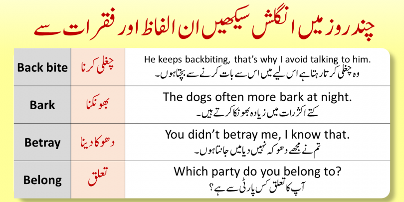 | Backbite | چغلی کرنا | He keeps backbiting, that is why I avoid talking to him |