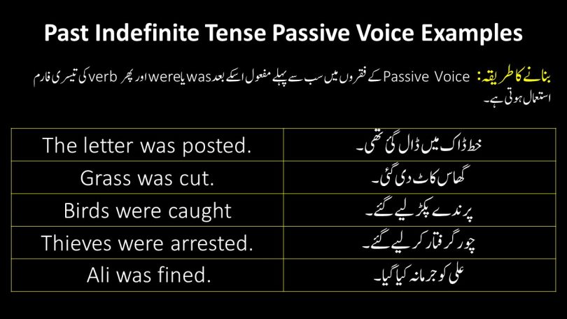 In the table below, you will learn to past Indefinite passive voice tenses with simple Urdu to English sentences. Just scroll down and learn these sentences.